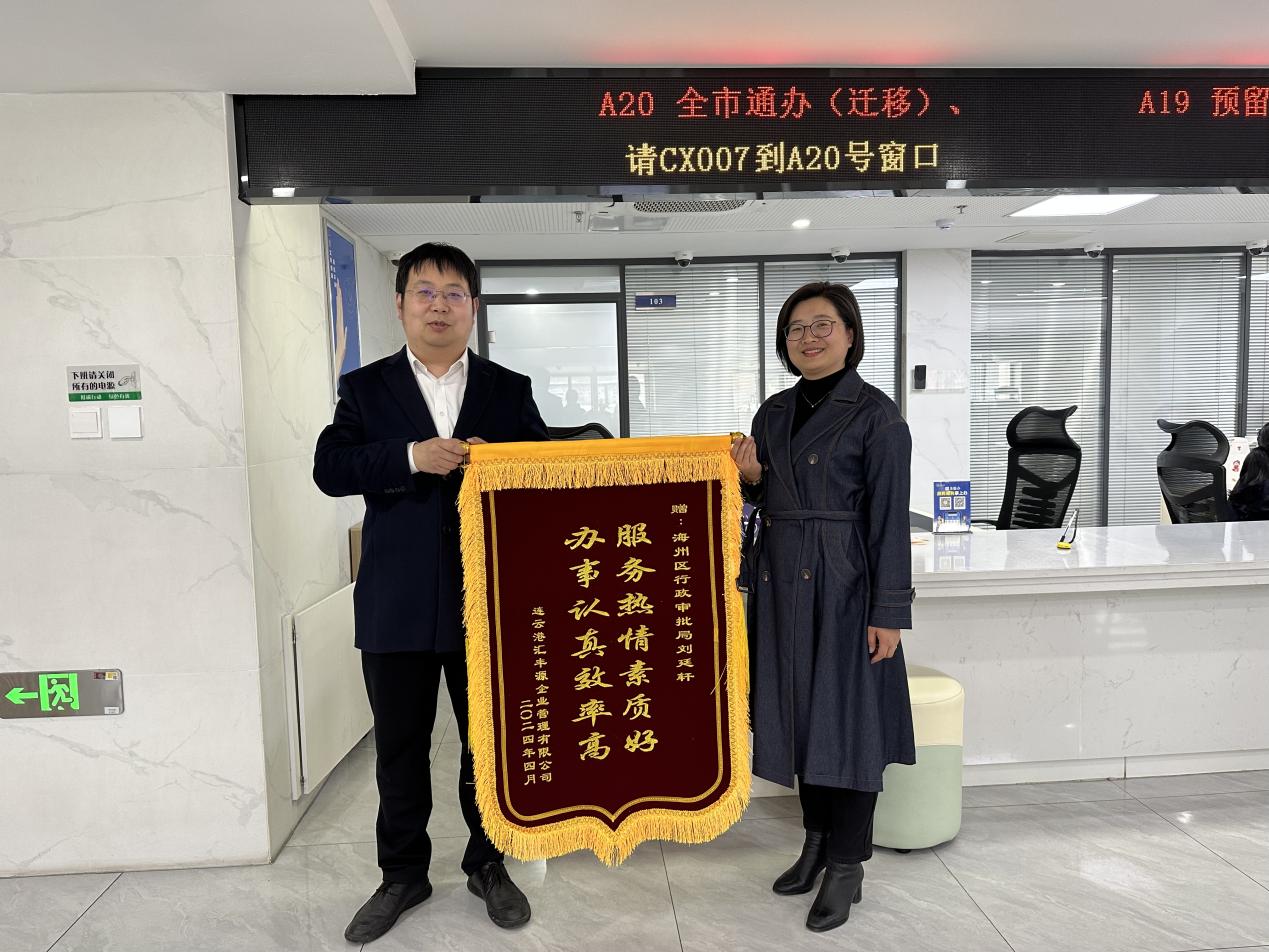 “服务热情素质好 办事认真效率高”“优质服务暖人心 便捷审批效率高”,4月7日下午,两位办事群众不约而同的将两面感谢锦旗送至海州区政务服务中心,点赞企业登记综合服务区工作人员们热情的服务态度和高效的业务水平。