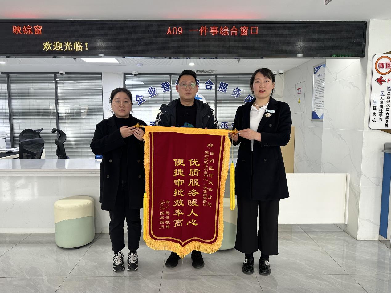 “双份锦旗,双重肯定,锦旗是荣誉,更是责任,每面锦旗都代表着企业和群众对中心工作的认可和支持,给予我们每名工作人员莫大的鞭策与鼓励,我们将以更优质、更高效的审批,服务好每一位办事群众。”海州区政务服务中心主任范敏说。(撰稿:王慧 李颖娴 审核:范敏)