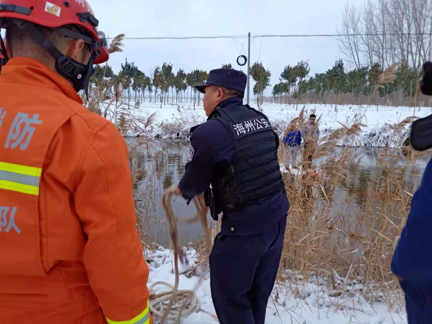 因天气寒冷,获救后,两男子惊魂未定、瑟瑟发抖、不停搓手、连声谢恩。民警立即协调附近一户人家,让男子到屋里烤火取暖,并协调村民给两男子找来棉袄等衣物防寒,然后将交通事故移交给随后赶来的交警处理。