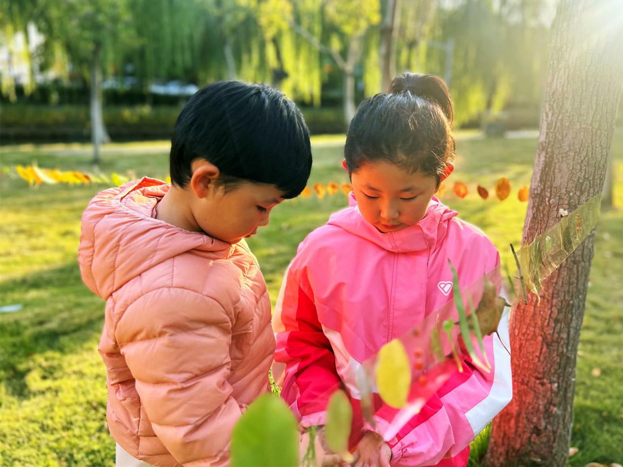活动中,艺北社区、巨龙社区联合辖区幼儿园,带领孩子们走进苍梧绿园,感受季节变化。孩子们手持小筐,仔细寻找季节变换的踪迹——金黄的银杏叶、火红的枫叶以及形态各异的落叶都成了他们眼中的“宝贝”。在社工的引导下,孩子们认真观察叶片的形状、脉络与色彩,感受大自然的神奇魅力。