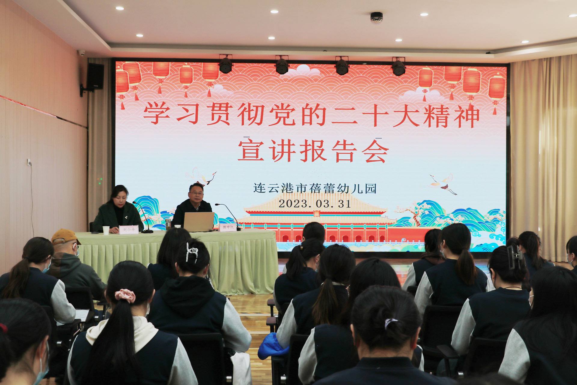 为全面深入学习宣传贯彻党的二十大精神,持续掀起学习宣传贯彻热潮,进一步把思想和行动统一到党中央决策部署上来,2023年3月31日下午,蓓蕾幼儿园举行学习贯彻党的二十大精神宣讲报告会。海州区教育局宣讲团成员、教育工委书记陈守权作宣讲报告,幼儿园党支部书记、园长刘小平主持会议,园班子成员和全体教职工参会。