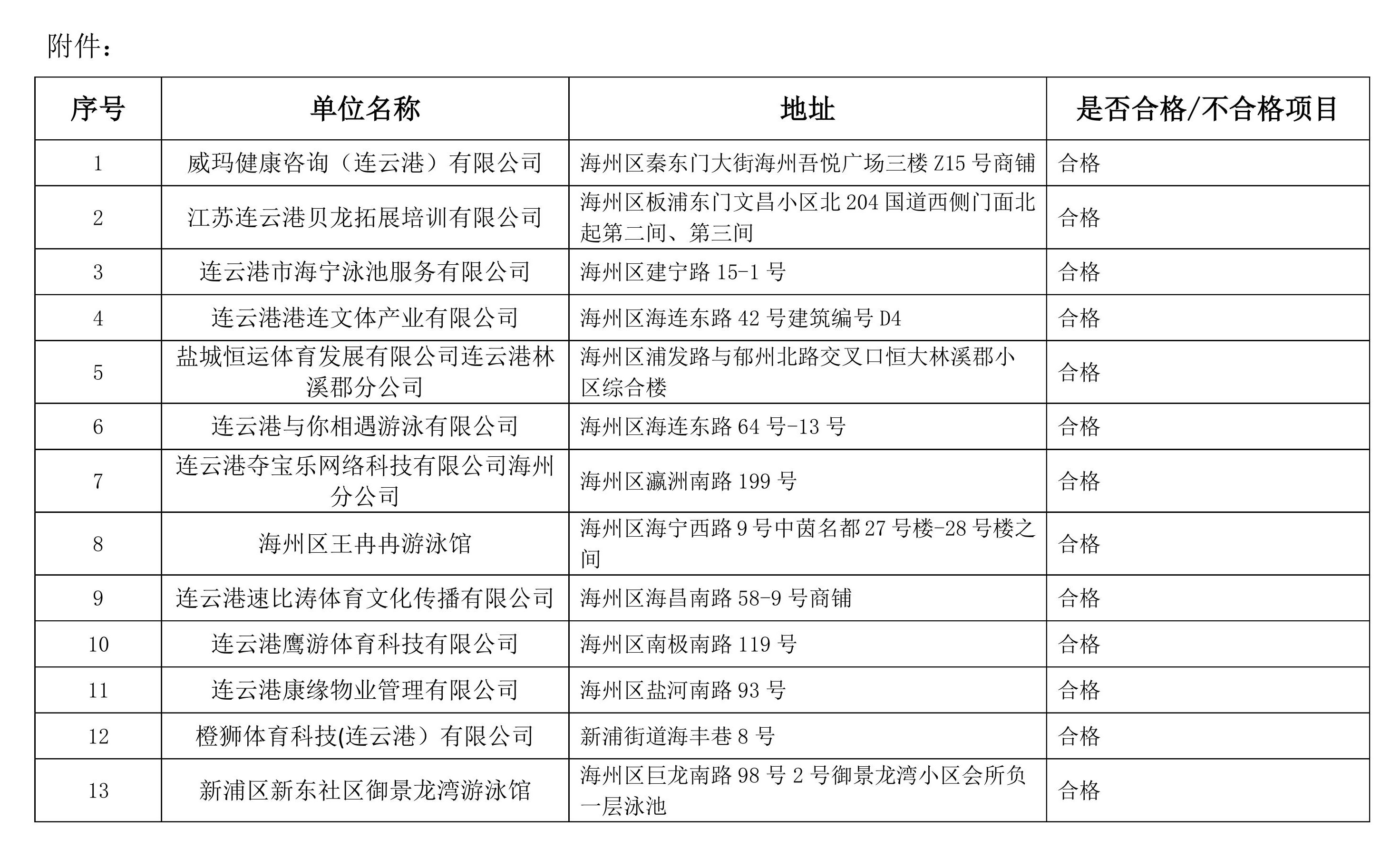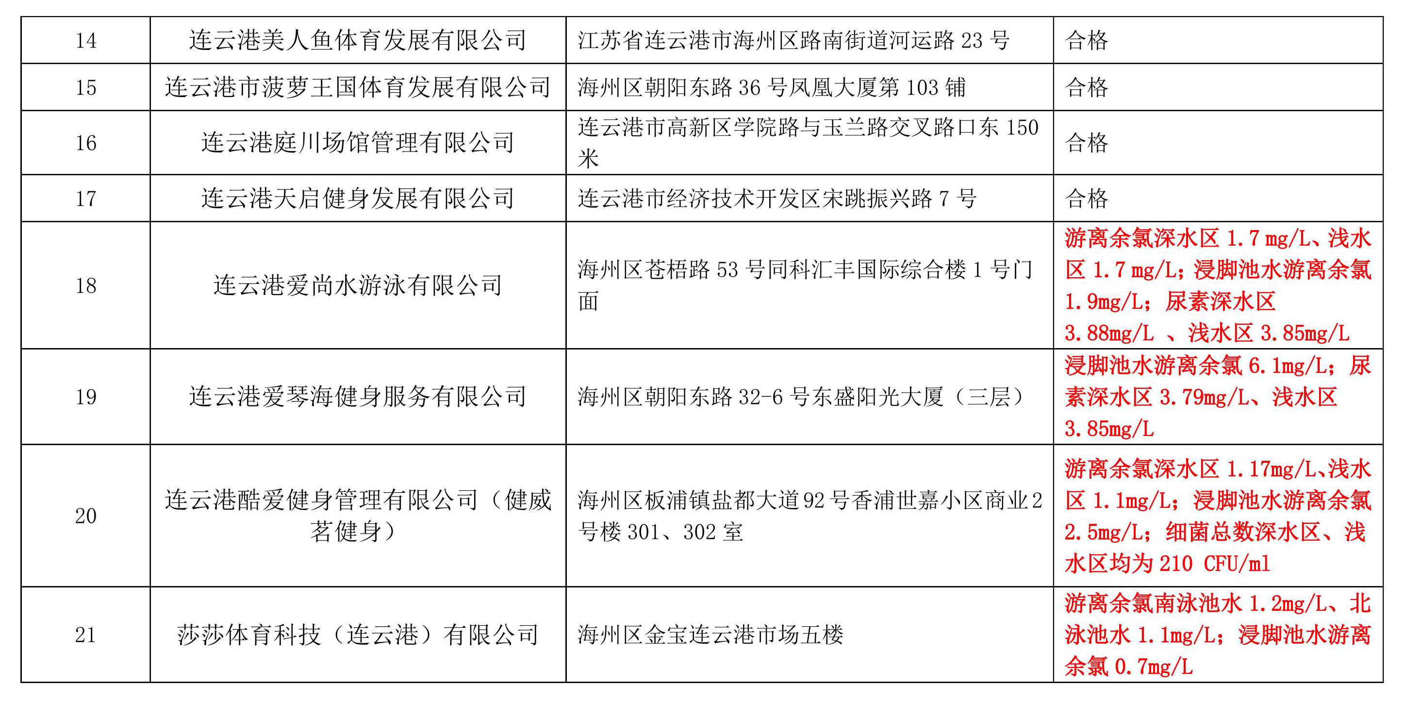 2023年8月2-4日,海州区卫健委针对全区21家游泳场馆开展日常监督检查工作以及夏季第三批次水质监督监测抽检工作。经监督检查,发现个别游泳场馆存在卫生管理制度落实不到位、池水公共卫生公示牌每日水质检查信息更新不及时、浸脚池水偏少、相关许可证健康证水质检测报告未上墙公示等问题,卫生监督员对上述问题当场下达了《卫生监督意见书》要求游泳场所立即整改,后续将对整改情况进行回头看。经第三方检测公司检验,结果表明我区21家游泳场馆的水质17家合格、4家不符合GB-37488-2019《公共场所卫生指标及限制要求》,对不合格的四家游泳场馆责令其立即改正。现将本次检测结果予以公示。