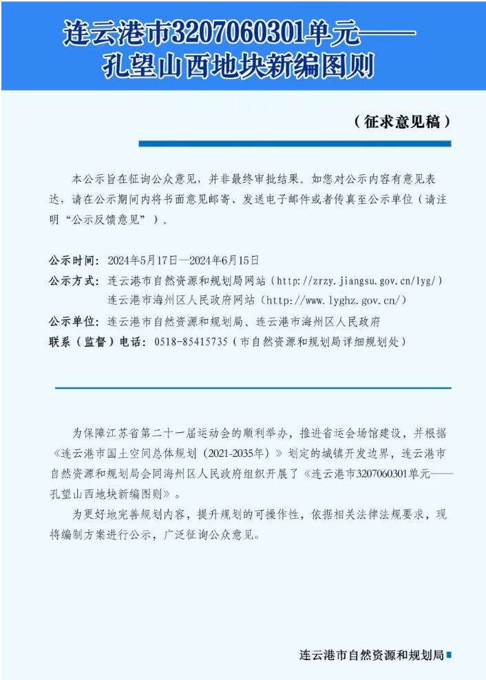 为保障江苏省第二十一届运动会的顺利举办,推进省运会场馆建设,并根据《连云港市国土空间总体规划(2021-2035年)》划定的城镇开发边界,连云港市自然资源和规划局会同海州区人民政府组织开展了《连云港市3207060301单元——孔望山西地块新编图则》。