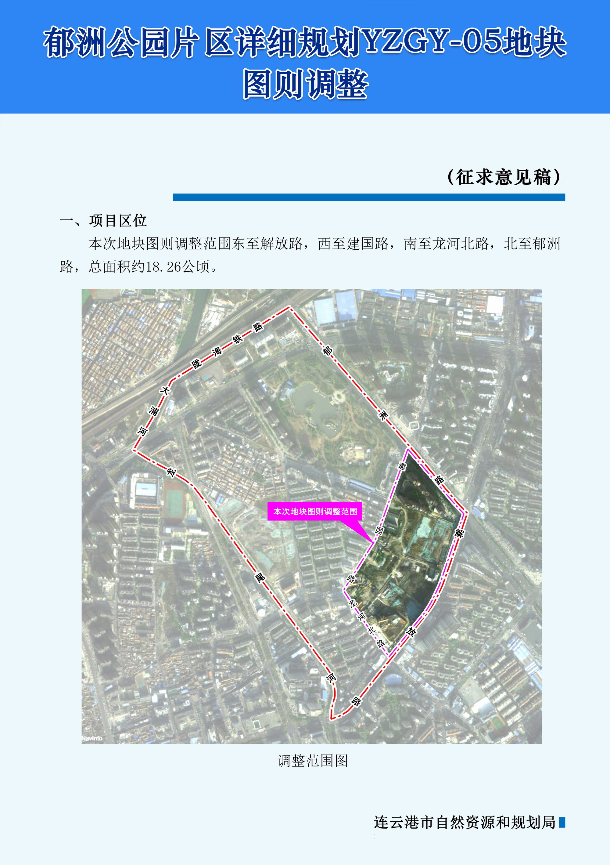 根据文物保护工作相关要求,为加强郁洲公园片区历史文化资源保护,优化交通组织和公共服务体系,加快推进片区开发建设,连云港市自然资源和规划局会同海州区人民政府组织开展《郁洲公园片区详细规划YZGY-05地块图则调整》编制工作。